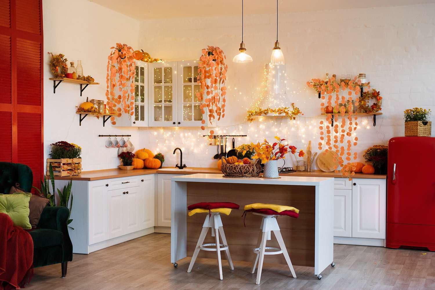 - NATURAL LOOKING DECOR: This artificial eucalyptus garland uses a blend of orange leaves to mimic the look of autumn eucalyptus vines hanging in a natural setting.