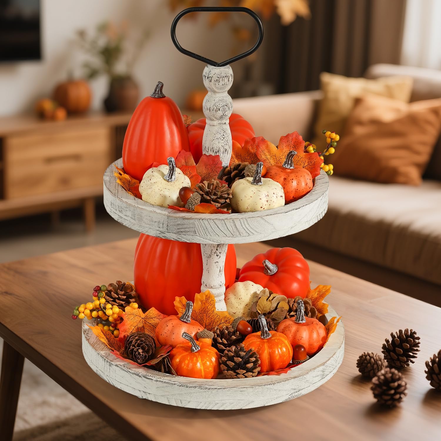 - There are 9 pumpkins with 3 different colors, 30 pieces of assorted maple leaves, 4 pieces of pine cones, 6 pieces acorns, 2 pieces of autumn orange berry stems. There are 51 items in total, which can meet your various needs.